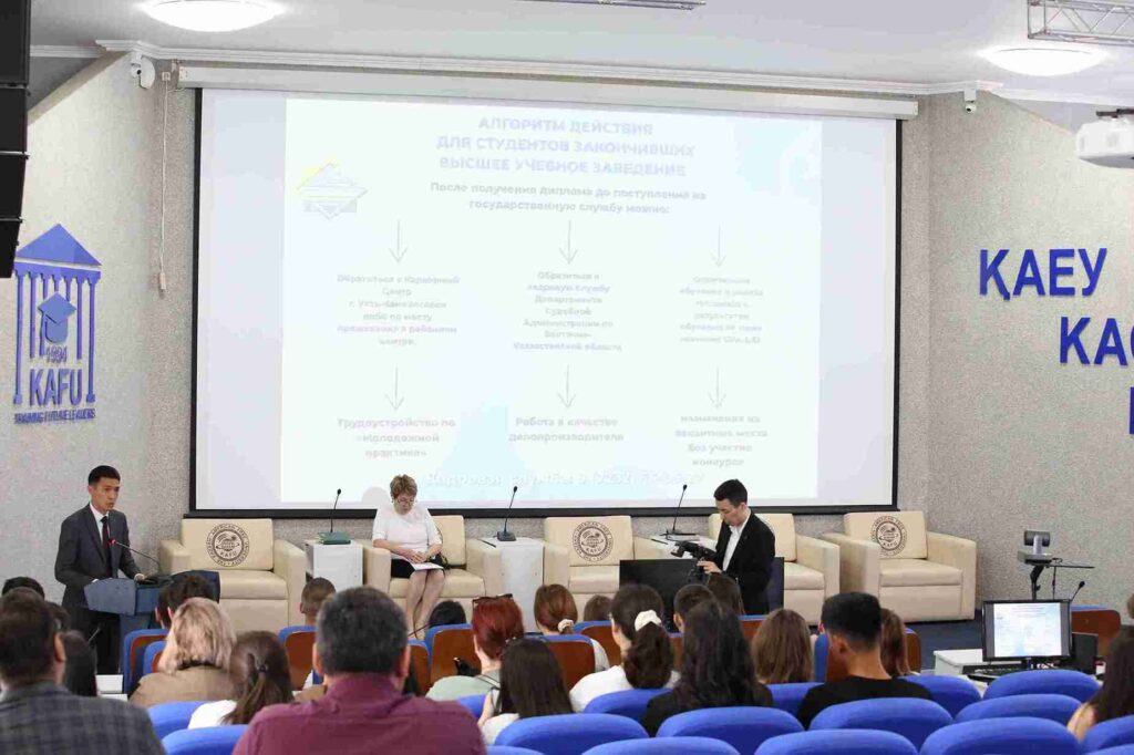 On June 4, 2025, a business meeting of students and teachers with the Deputy Head of the Department of Judicial Administration of the East Kazakhstan region Zh.A. Erenbakov and the Head of the HR Department S.T. Serikpayeva was held at the Department of Law and International Relations of KAFU.